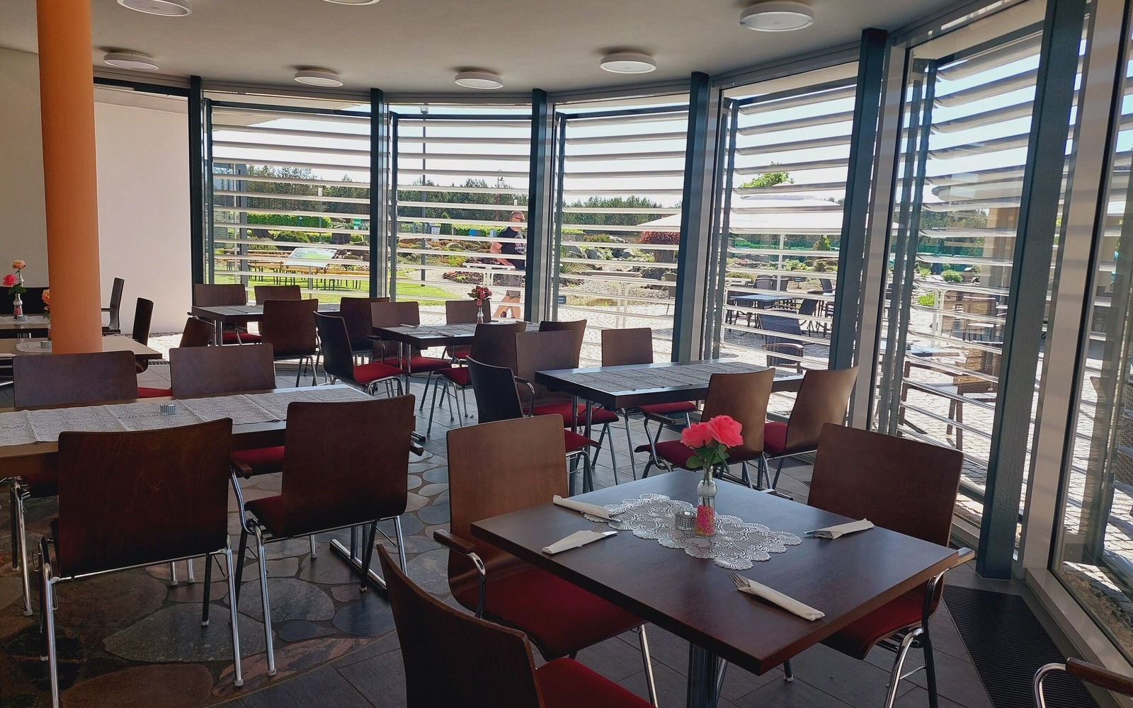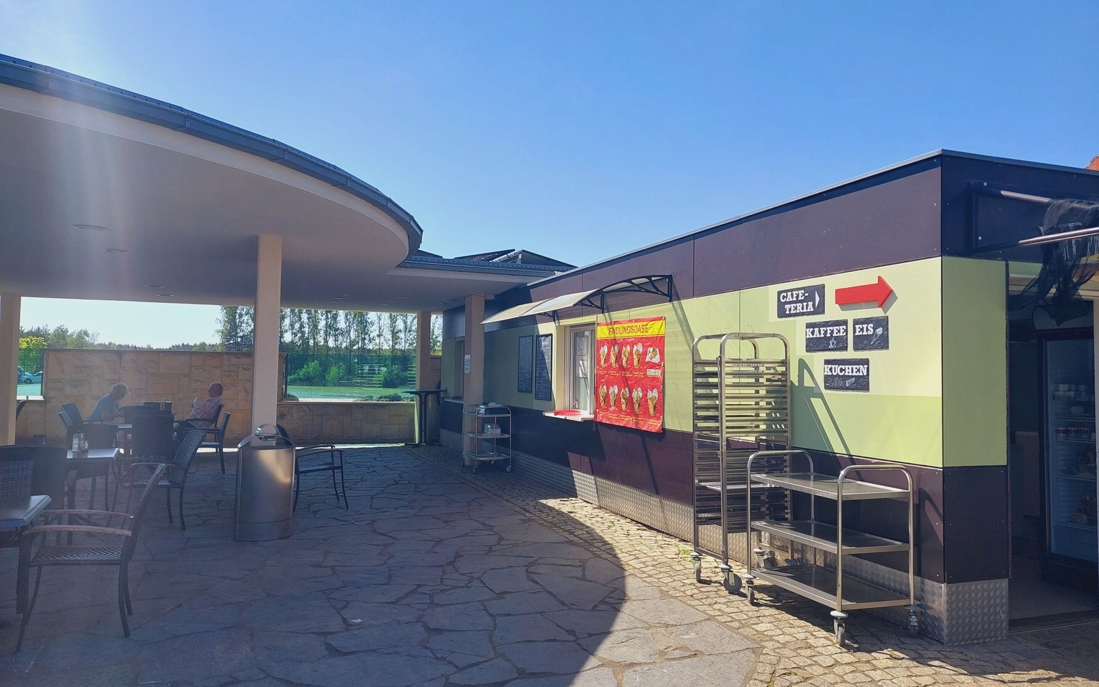 Die Findlingsoase befindet sich direkt im Gebäudekomplex des Besucherzentrums mit den markant geschwungenen und begrünten Dächern. Ein überdachter Außenbereich ermöglicht in den warmen Jahreszeiten einen Blick über die Anlage.