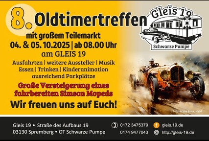 Am 4. und 5. Oktober 2025 lädt das GLEIS 19 in Spremberg zum 8. Oldtimertreffen ein. An beiden Tagen ab 8 Uhr erwartet die Besucher ein vielfältiges Programm, ein großer Teilemarkt, traditionelles Handwerk wie Verchromung und Zweiradmechanik sowie kulinarische Angebote von Fleischerei Henne, Kanonenfee Viola, Konditorei Beeg und Mony’s Cocktailbar. Am Sonnabend führt eine Ausfahrt gegen 11 Uhr zum Schloss Hornow (ca. 20 km). Der Sonntag bietet eine Fahrzeugpräsentation, Blasmusik und als Höhepunkt ab 14 Uhr die Versteigerung eines fahrbereiten Simson-Modells. Ein großer Spielplatz und Kinderunterhaltung sorgen auch bei den jüngsten Gästen für Freude. Die Teilnahme ist kostenfrei, es gibt weder Nenn- noch Eintrittsgebühren. Lediglich das Parken kostet 1 Euro.