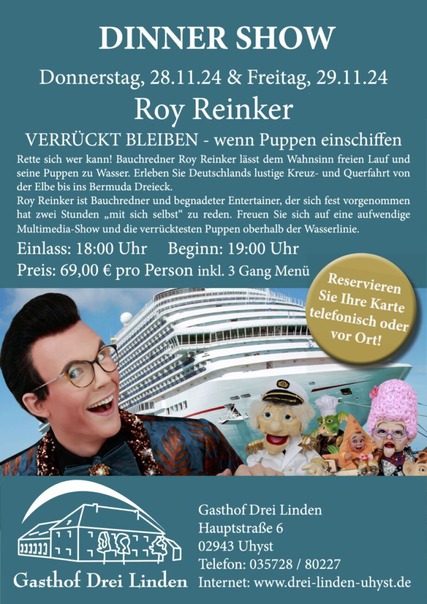 Rette sich wer kann! Bauchredner Roy Reinker lässt dem Wahnsinn freien Lauf und seine Puppen zu Wasser. Erleben Sie Deutschlands lustige Kreuz- und Querfahrt von der Elbe bis ins Bermuda Dreieck.