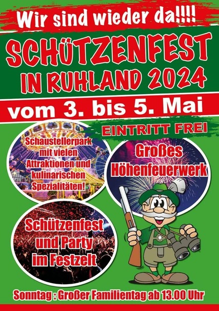 Am 03.05.2024 21:00 Uhr Fackelumzug ab Marktplatz / ab 04.05 ab 10:00 Uhr Schießen um den Pokal des Bürgermeisters / Armbrustschießen auf den Holzadler für die eingeladenen Vereine /04.05.2024 ab 19:00 Uhr Disco im Festzelt / 22:00 Uhr Großes Feuerwerk / am 05.05.2024 ab 10:00 Uhr Frühshoppen und Schießwettbewerbe / ab 13:00 Uhr Großer Familientag /15:00 Uhr Kaffee und Kuchen am Samstag und Sonntag / 17:00 Uhr Siegerehrug des Stadtmeisters und Übergabe des Pokals des Bürgermeisters. Für Klein und Groß gibt es einen Schaustellerpark.