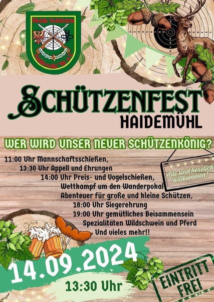 Der Heide Schützen Haidemühl ´96 e.V. lädt herzlich zum traditionellen Schützenfest ein. Erleben Sie spannende Wettkämpfe, das feierliche Krönungszeremoniell und die einzigartige Atmosphäre unseres traditionsreichen Festes. Nach den Wettkämpfen laden wir Sie zu einem gemütlichen Beisammensein ein. Lassen Sie den Tag in geselliger Runde bei leckeren Speisen, erfrischendenGetränken und anregenden Gesprächen entspannt ausklingen.