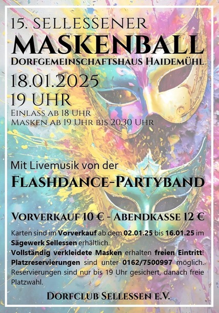Außerirdische, Märchenfiguren, Filmhelden, selbst Gangster und Zombies wurden schon beim Sellessener Maskenball gesichtet. Wer sich diesmal die Ehre gibt, können die Gäste am 18. Januar 2025 herausfinden. Dann öffnet das Team des Sellessener Dorfclubs das Dorfgemeinschaftshaus Haidemühl zum 15. Sellessener Maskenball.