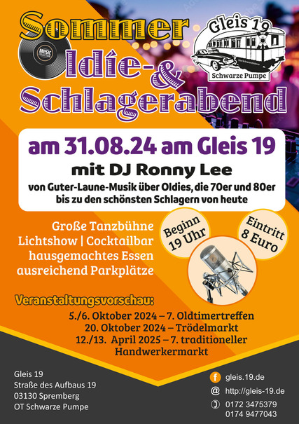 Erleben Sie einen unvergesslichen Sommer Oldie- & Schlagerabend! DJ Ronny Lee bringt die besten Oldies und Schlagerhits auf die große Tanzbühne und sorgt für ausgelassene Stimmung. Begleitet von einer spektakulären Lichtershow laden wir Sie ein, das Tanzbein zu schwingen und in nostalgischen Klängen zu schwelgen.