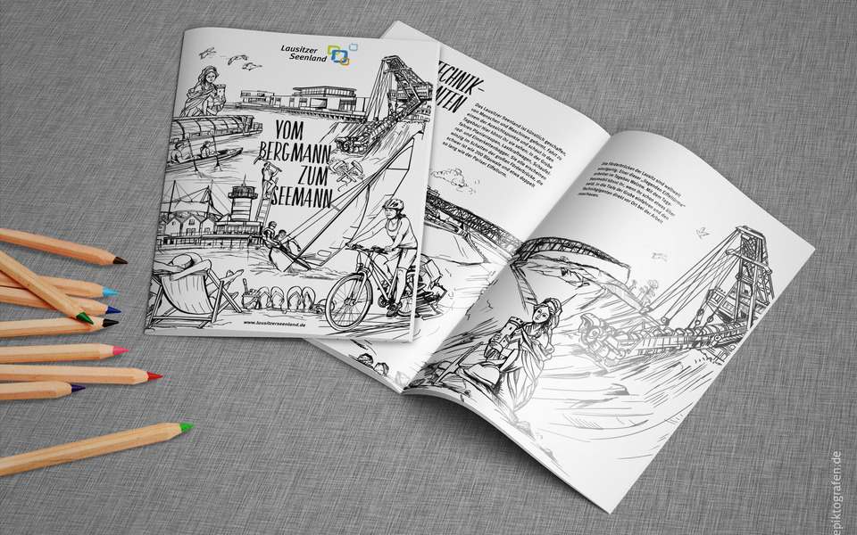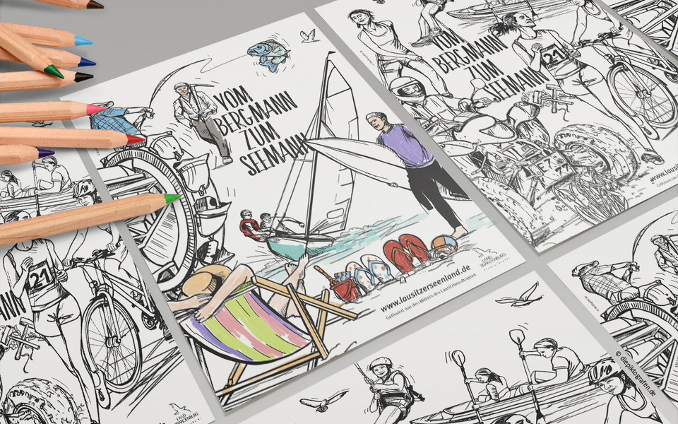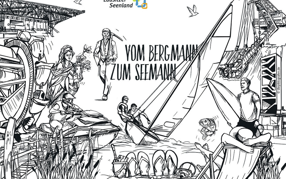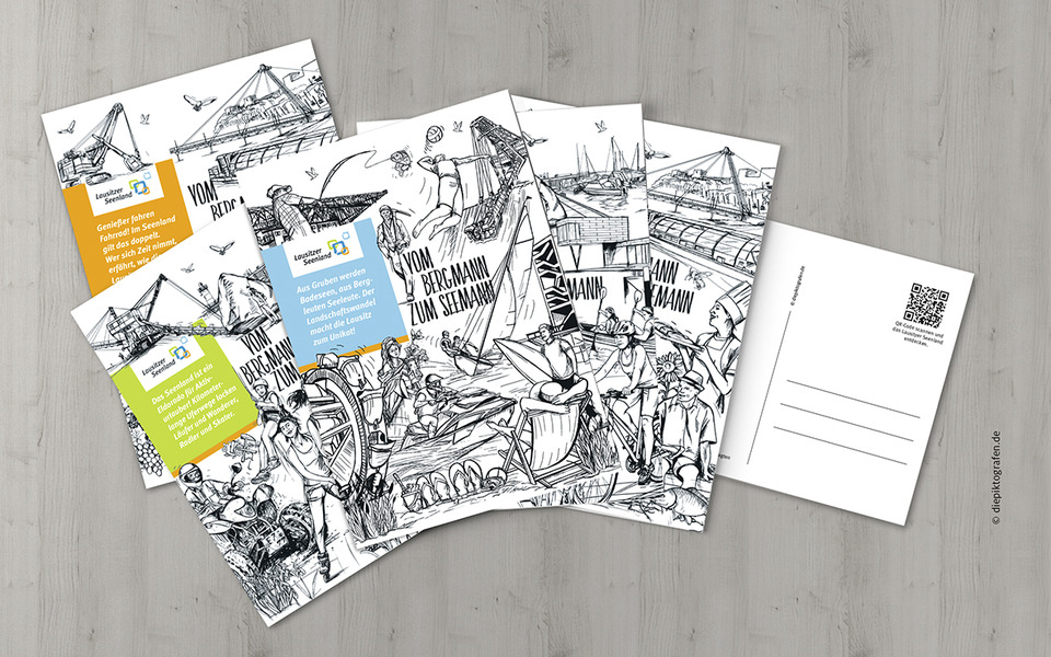 Mit der Kampagne „Vom Bergmann zum Seemann“ will der Tourismusverband Lausitzer Seenland e.V. Aufmerksamkeit für den einmaligen Wandel vom Bergbaurevier zur Urlaubsregion mit mehr als 20 Seen und schiffbaren Kanälen schaffen. Gemeinsam mit der Agentur Die Piktografen GmbH und der Textwerkstatt Ute Baumgarten wurden Illustrationen entwickelt, die Einheimischen und Urlaubern die Geschichte des Lausitzer Seenland verständlich und positiv vermitteln sollen. Die Idee dahinter: Illustrationen machen neugierig. Entstanden sind Bilder, die viel erzählen. Die Illustrationen zeigen beispielhaft neue Häfen, Förderbrücken, schwimmende Häuser, Bergbaugeräte, Leuchttürme, Bergmänner, Schiffe und Urlauber, die Radfahren, Baden oder Boot fahren. Sie zieren Postkarten, Bierdeckel, Prospekte, Malbücher, Banner und Planen. Die Kampagne richtet sich sowohl an Gäste als auch an die einheimische Bevölkerung. Partner aus dem Tourismus, der Wirtschaft sowie Kommunen und Landkreise wurden und werden in die Kampagne einbezogen. Ziel ist es, die Attraktivität und Bindungskraft der Region zu stärken, die Aufbruchsstimmung zu zeigen und auf ihre Zukunftsfähigkeit aufmerksam zu machen. „Die Illustrationen fallen auf. Der einmalige Landschaftswandel wird mit den gezeichneten Botschaften auf eine originelle und spannende Art und Weise erzählt. Sie bringen die Geschichte des Lausitzer Seenland auf den Punkt“, so Kathrin Winkler, Geschäftsführerin des Tourismusverbandes Lausitzer Seenland e.V. Das Projekt wurde aus Mitteln des Lausitzbeauftragten des Landes Brandenburg gefördert.